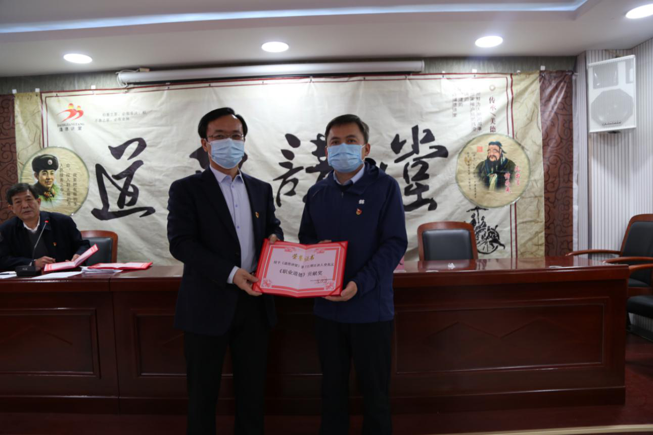 最后,党委副书记、院长田忠斌同志为其颁发了“职业道德贡献奖”证书。本期道德讲堂在大家齐声高唱《物测院之歌》中圆满结束。