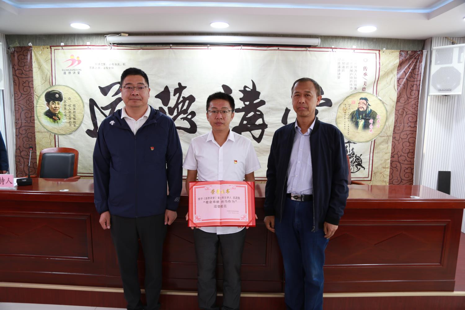 最后,晋中市科技局党组书记、局长南宏,晋中市科技局党组成员、副局长傅元智为郝源隆颁发了《敬业奉献 担当作为》道德模范证书,本期道德讲堂在大家齐声高唱《学习雷锋好榜样》的歌声中圆满结束。