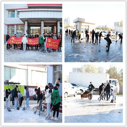 初雪突降,气温骤降,给道路交通带来诸多不便,为消除道路结冰,实实在在为群众办事,院党委组织院志愿者、实体部门、各党支部齐上阵进行除冰扫雪活动。