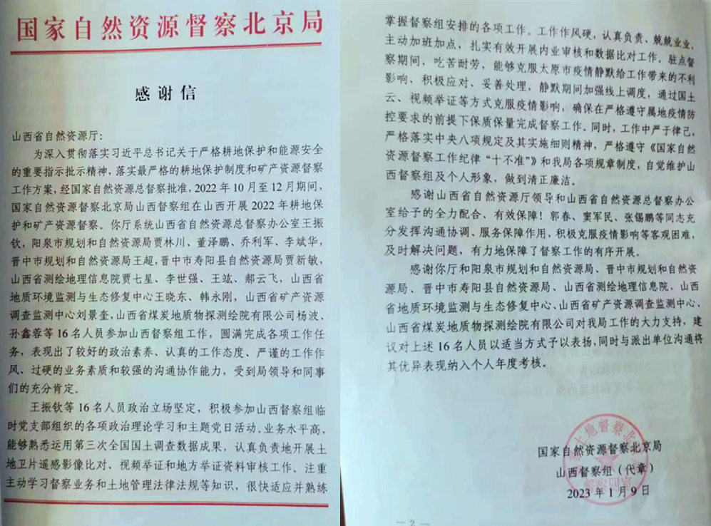 近日,国家自然资源督查北京局发来感谢信,对物测院两名职工在参加山西开展的2022年耕地保护和矿产资源督察工作期的辛苦付出和突出贡献给予表扬和感谢。