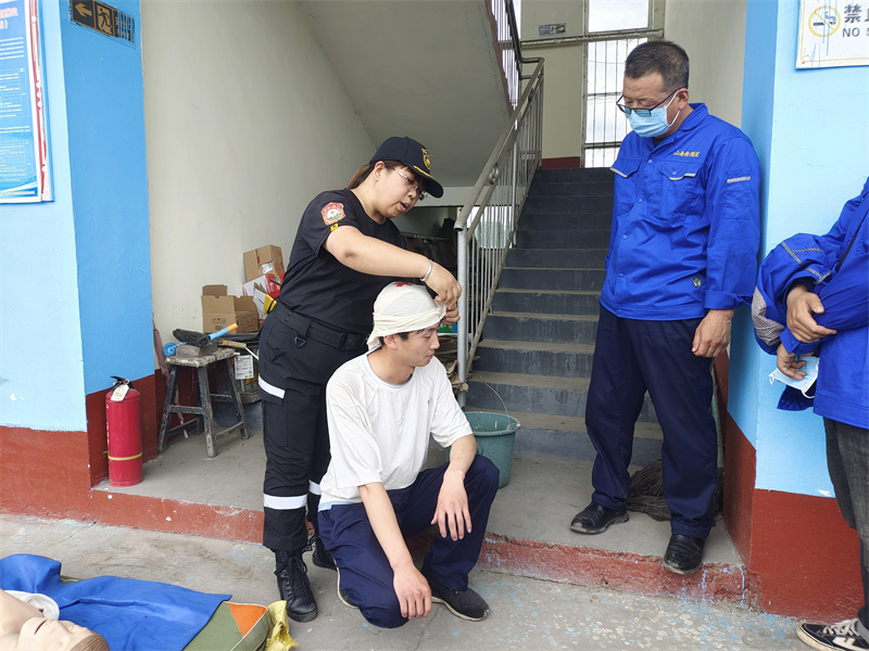 紧接着演练环节,李翠红老师现场讲解并演示了心肺复苏、人工呼吸施展急救的判定条件、准备要素、实施方法和注意事项,现场演示了AED体外除颤仪的使用和绷带包扎手法。参演人员在老师的指导下纷纷上前操作,轮流练习。