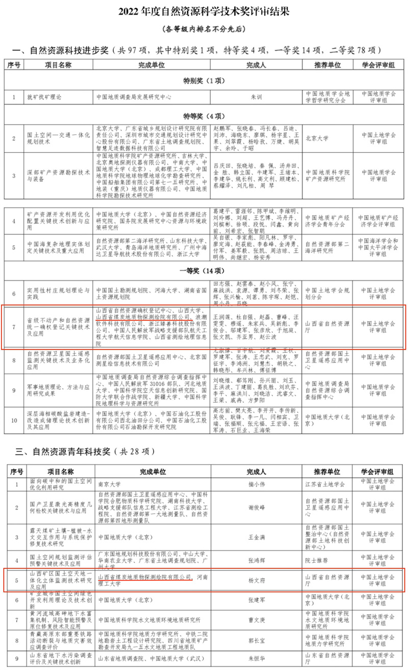 近日,2022年度自然资源科学技术奖(土地组)获奖名单公布,山西省煤炭地质物探测绘院有限公司“省级不动产和自然资源统一确权登记关键技术及应用”“山西矿区国土空天地一体化立体监测技术研究及应用”两项成果分别荣获自然资源科技进步奖一等奖、自然资源青年科技奖。