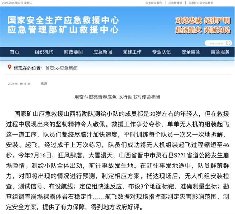 近日,国家安全生产应急救援中心宣传网站发布了国家安全生产应急救援队伍(简称国家专业队)的青年指战员在各行各业奋斗中的先进事迹,国家矿山应急救援山西特勘队物测中队以卓越的表现,荣登网站,被广泛宣传。