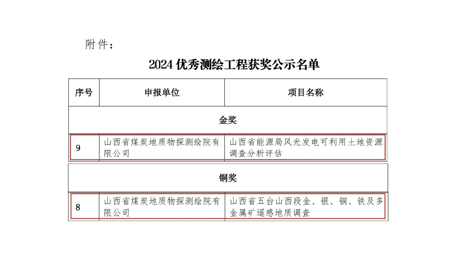近日,山西省测绘学会2024优秀测绘工程奖评选结果予以公示,由山西省煤炭地质物探测绘院有限公司航测遥感中心独立承担的“山西省能源局风光发电可利用土地资源调查分析评估”和“山西省五台山西段金、银、铜、铁及多金属矿遥感地质调查”分别荣获2024年山西省测绘学会优秀测绘工程奖金奖和铜奖。