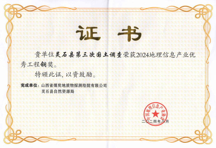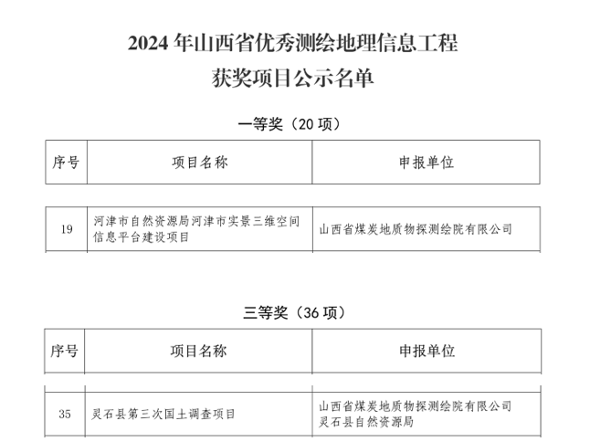 近日,2024年山西省优秀测绘地理信息工程获奖项目予以公示,物测院有限公司承担的“河津市自然资源局河津市实景三维空间信息平台建设项目”荣获山西省优秀测绘地理信息工程一等奖。此前,“灵石县第三次国土调查项目”荣获了中国地理信息产业协会2024年地理信息产业优秀工程铜奖。