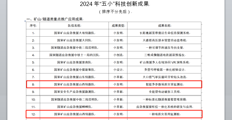 近日,国家安全生产应急救援中心公布了2024年“五小”科技创新成果名单,物测中队上报的两项成果脱颖而出,一项荣获重点推广应用成果,一项被评为创新成果,为安全生产应急救援技术装备进步贡献了智慧与力量。