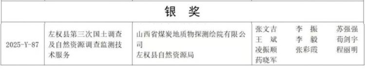 近日,2025年度地理信息产业优秀工程获奖项目公示,由山西省煤炭地质物探测绘院有限公司生态环境中心负责的《左权县第三次国土调查及自然资源调查监测技术服务》项目,凭借卓越的工程质量与创新性技术应用,荣获“2025地理信息产业优秀工程银奖”。