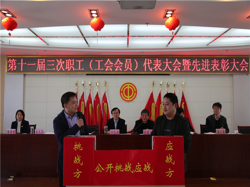 会上,15个部门负责人分8个方阵在大会上进行了公开挑战和应战,接受所有参会职工的监督;审议并通过了院长田忠斌同志所作的工作报告、2018年财务决算报告、2018年“三公”经费使用情况、2018年工会工作报告、向大会报告十一届二次职代会提案落实情况、解答十一届三次职工提案报告、表彰了2018年先进集体和先进个人等事项。