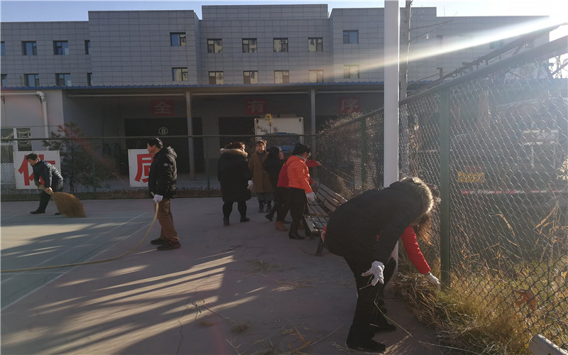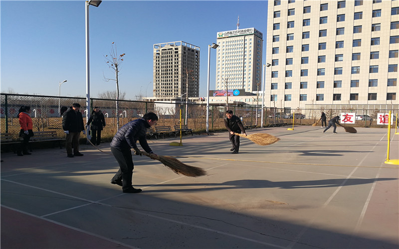 清扫现场,大家冒着凛冽的寒风热火朝天的干着,有的手持扫帚清扫灰尘、有的清理围栏外的杂草、有的用水管冲洗场地……经过大家二个多小时的努力劳动,篮球场和羽毛球场地焕然一新,为广大职工日??固逵土队斐鲆桓龈删皇媸实幕疃肪?。