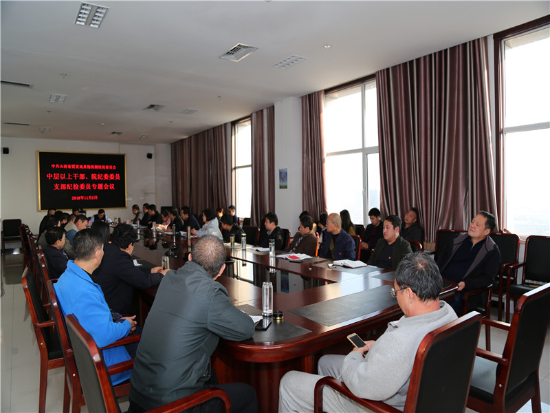 2018年11月2日下午,物测院党委召开中层以上领导干部、院纪委委员、支部纪检委员专题会议,迅速传达贯彻省煤炭地质局党委2018年11月2日上午中层干部会议精神。