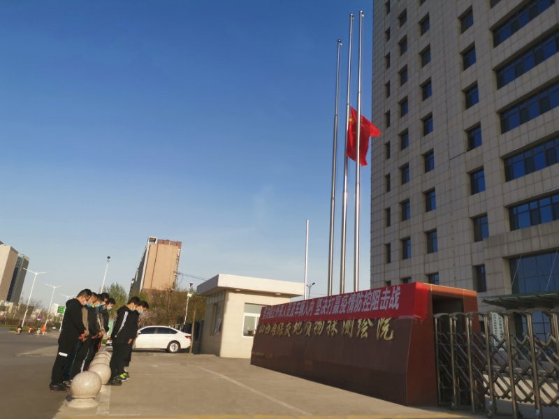 2020年4月4日10时整,防空警报鸣响之时,所在物测院办公区域下半旗志哀。所有值班值守工作人员神情凝重面向国旗肃立,向抗击新冠肺炎疫情斗争牺牲烈士和逝世同胞默哀,以表达全院干部职工以最深的怀念为英雄送行。