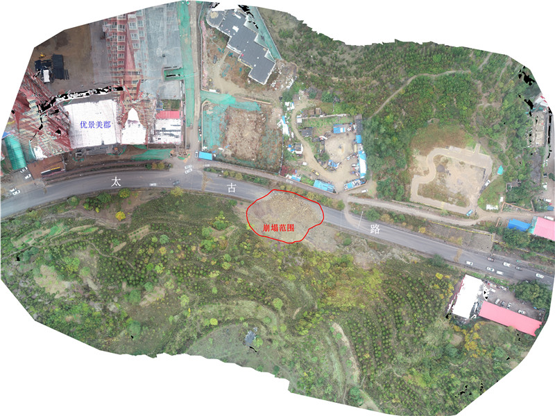 受当地国土资源局、交通运输局紧急邀请,2019年10月5日、6日,山西省煤炭地质物探测绘院调用无人机,组织相关专业技术人员对现场进行了调查和航拍,编制了崩塌破坏范围正射影像图和大比例尺地形图,估算了崩塌体土石方量,并综合现场巡查和无人机航拍情况,对此处灾害点提出应急处置建议。