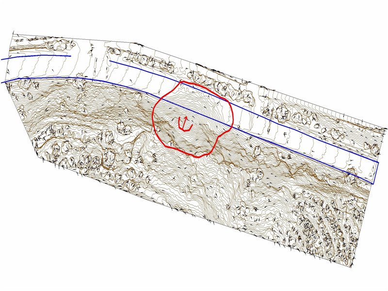 同时可利用数字高程模型快速生成测区等高线图,实时显示地表高程,作为处置方案设计用图。见图3快速等高线图.